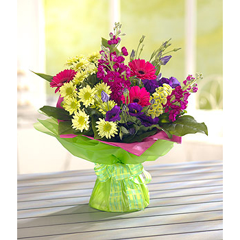 A bright bouquet of vibrant summer shades. cerises, purples and limes ,includes lisianthus, chrysanthemums and stocks, which combine to make this fantasically frangrant arrangement.