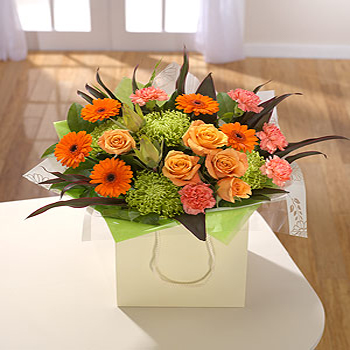 Orange Roses, Carnations and Germini set against green bloom Chrysanthemum. This stunning arrangement is placed in a cream bag for an ideal gift for somebody special.