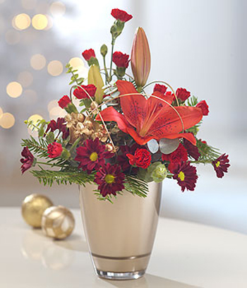 An attractive arrangement of rustic reds in the form of Lilies, Chrysanthemums, Carnations and Hypericum Berries, presented in a vase. A simply lovely Christmas flower gift and ideal centre piece.