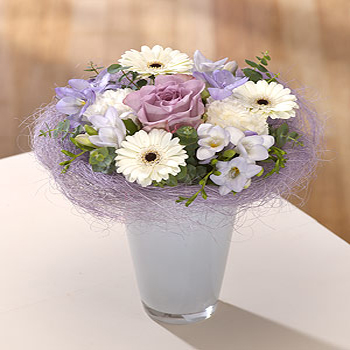 A single lavender Rose is central to this vase arrangement which sits in a sisal collar with lavender Gerbera, white Carnation, Germini and scented Freesia.