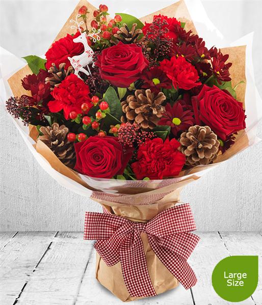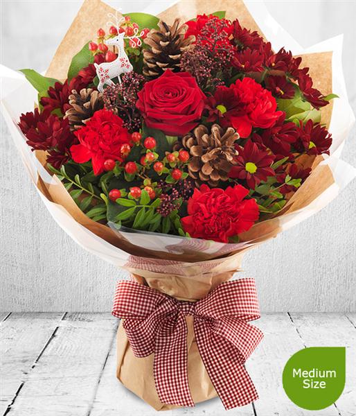 We've got Christmas all wrapped up with this pretty Aqua-pack Bouquet. red Roses, Chrysanthemums, Carnations, pine cones and berries.plus a festive reindeer pick.