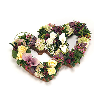 A stunning double heart shaped tribute in subtle colour scheme of pink, peach, bronze and lemon, including Lilies, Hydrangea, Roses and flowering foliage. Size: Height - 38cm (15") .
