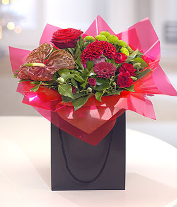 A gorgeous Christmas flower gift bag arrangement of sumptuous wine red blooms: Rose, Celosia, Germini, Chrysanthemum and Carnations.