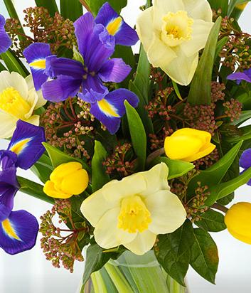 Send someone a ray of sunshine with the spring bouquet of blue iris, daffodils and yellow tulips finished with viburnum.