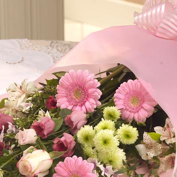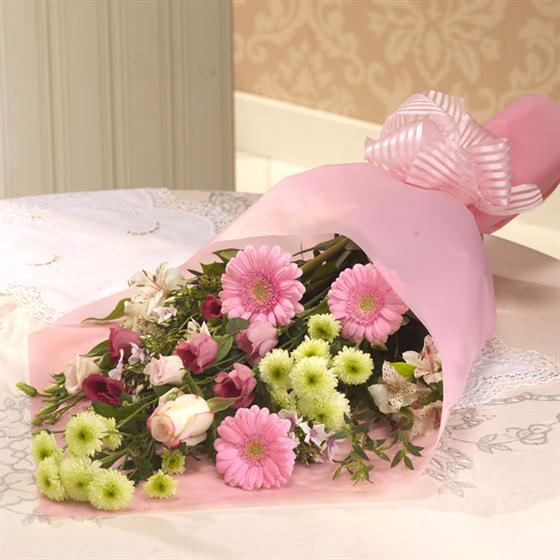 A beautifully gift wrapped bouquet including Lisianthus, Gerbera, Chrysanthemum and Phlox.