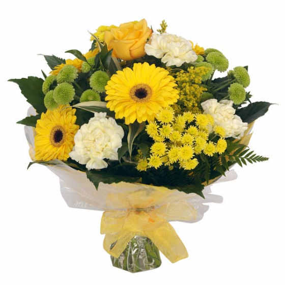 A beautiful Lemon and lime aqua handtied bouquet. Consisting of yellow Roses, yellow Gerbera, carnations and foliages. Wrapped in cellophane and tied with a natural raffia bow.