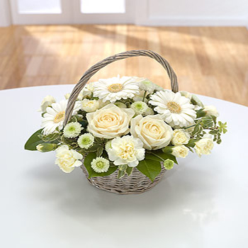 Pale and interesting? A white and cream basket arrangement of Roses, Germini, Carnations and Chrysanthemums.