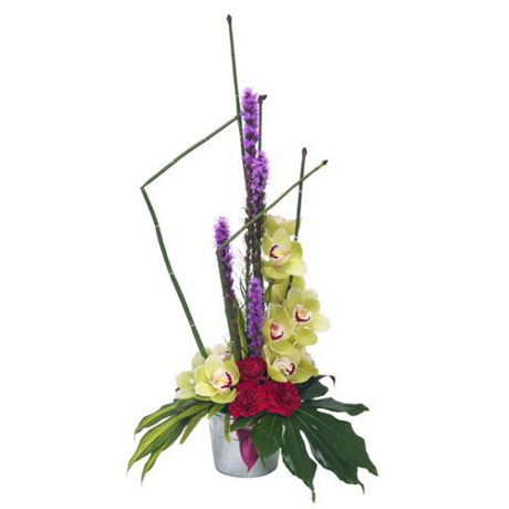 A striking modern tall container arrangement featuring Cymbidium Orchids, Carnations and Liatris. Flowers are arranged in floral foam for long lasting freshness and easy display.