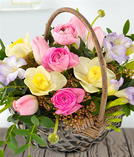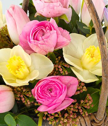 This aptly named arrangement is a beautiful basket of spring flowers in pastel pinks, yellows and lilacs. Featuring pink Ranunculus, lavender Freesia, pink Tulips, Daffodils and viburnum topped off with eucalyptus.