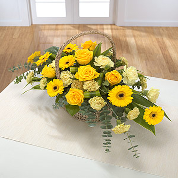 Classic basket arrangement in bright golds: golden Roses and Gerbera fight to outshine the rest of the bunch. Perfect for a Golden wedding anniversary gift.