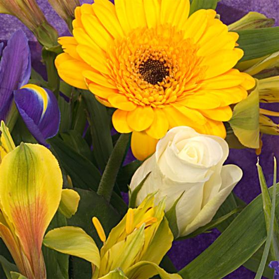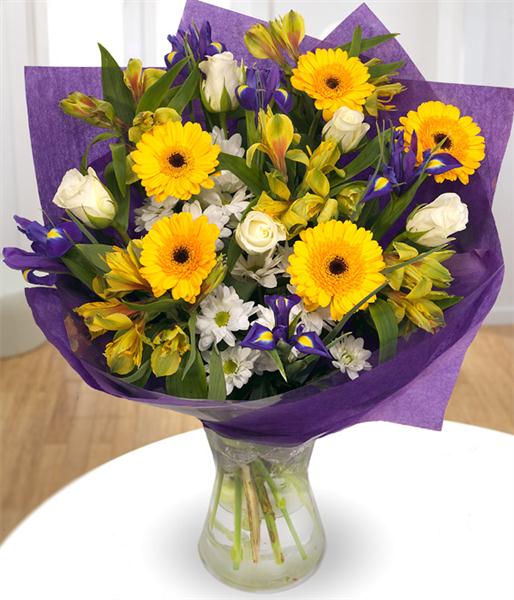 A bold yet delicately fragrant bouquet. Yellow Alstroemeria and Germinu are married perfectly with bold blue Irises. A touch of white Chrysanthmums and Eucalyptus complete the arrangement.