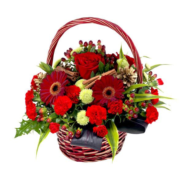 A christmassy red and gold basket arrangement, including gerbera, hypericum, chrysanths and cones.