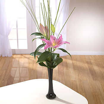 Not even Bear Grass and Aspidistra leaves can steal the limelight from this single stem of pink Lilies. Vase included.