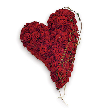 A truly stunning contemporary heart shaped tribute of massed red roses with simple bear grass strands and natural foliage edge. Size: Height - 50cm (20") Width - 32cm (13").