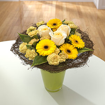 Roses, Germini and golden spray Chrysanthemums sit in this attractive, natural twig collar in a vase.