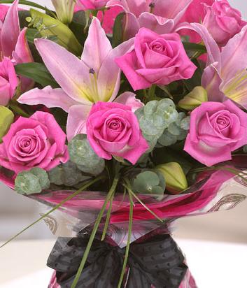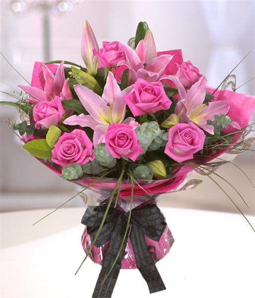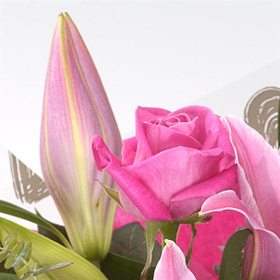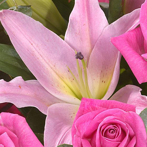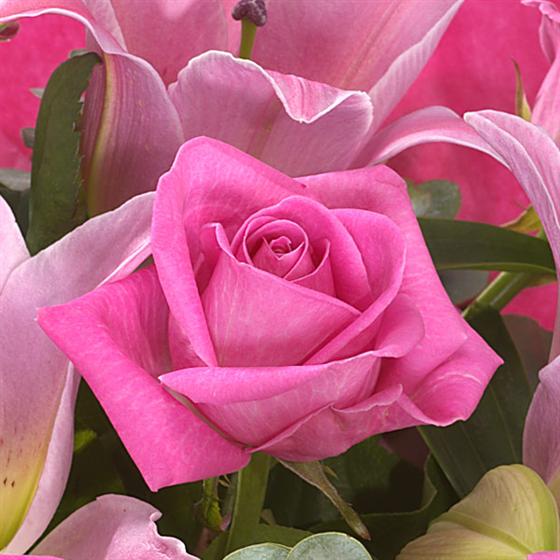 Perfectly pink Roses and Lilies for somebody special. This pretty aqua pack will melt her heart.