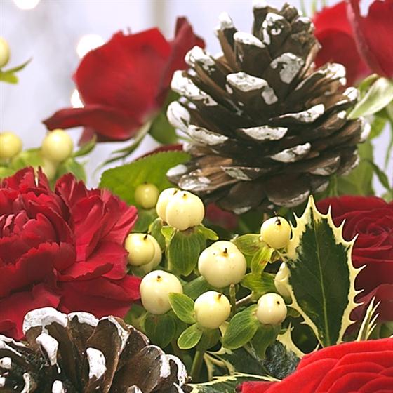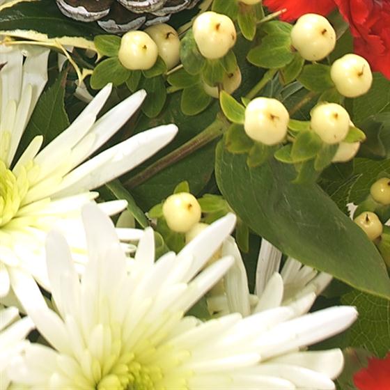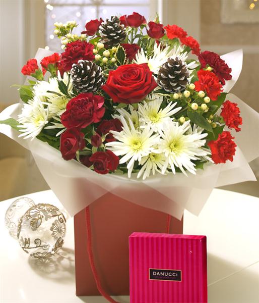 An ideal Christmas flower gift - rich red Roses married with deep red velvety Carnations sit perfectly alongside the creamy white flourishes of spray Chrysanthemums. White Pine Cones and a delicious box of Milk Chocolates completes the gift.