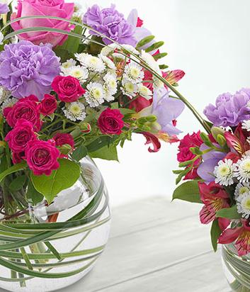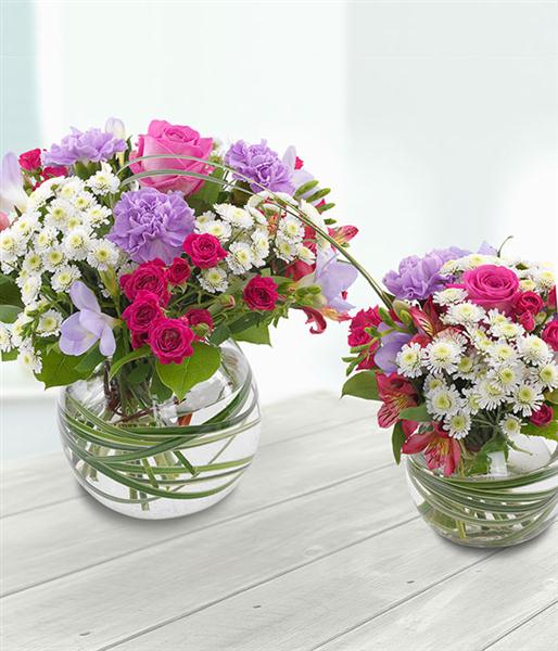 A beautiful gift for two. Pink Roses, lilac Freesias and Carnations married with white Spray Chrysanthemums in a spherical glass vase, connected to a smaller glass vase by Variegated China Grass.