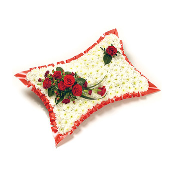 A classic white Chrysanthemum based pillow with ribbon edge. Featuring Roses, Carnations, Hypericum and complementary foliage. Size: 15 inches long.
