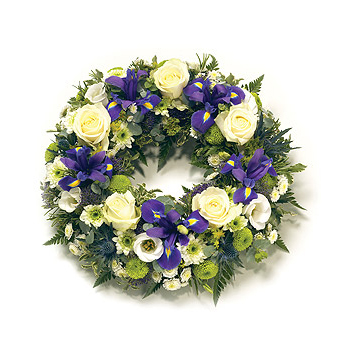 Open round wreath with natural foliage edge including Iris, Roses, Chrysanthemums and complementary foliage. Size: Diameter - 31cm (12").
