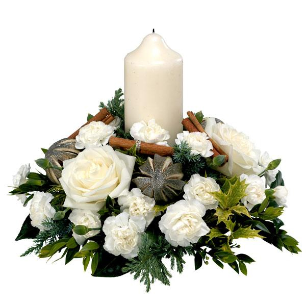 All white container arrangement including roses, spray carnations, cinnamon sticks, and a single candle in the centre.
